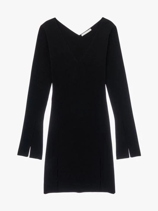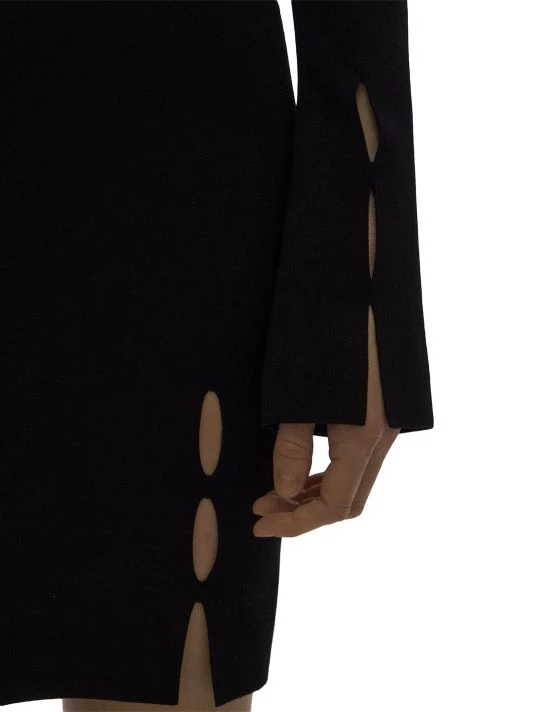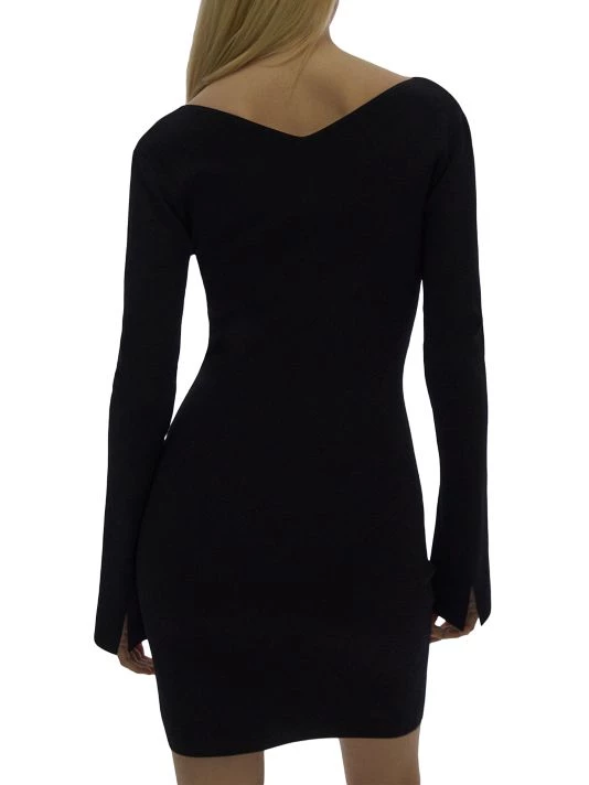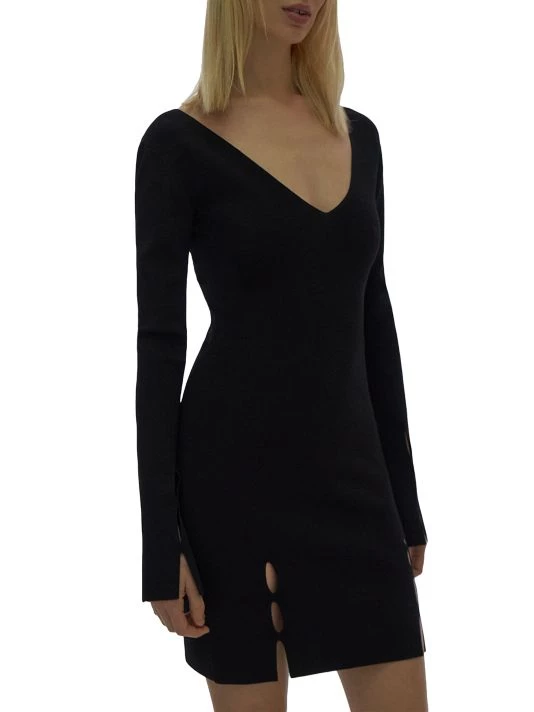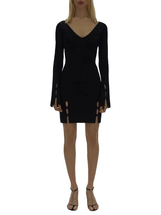 Cut from a rib-knit construction, Helmut Lang’s minidress features a V-neck, long sleeves, and subtle cutouts along the hem.