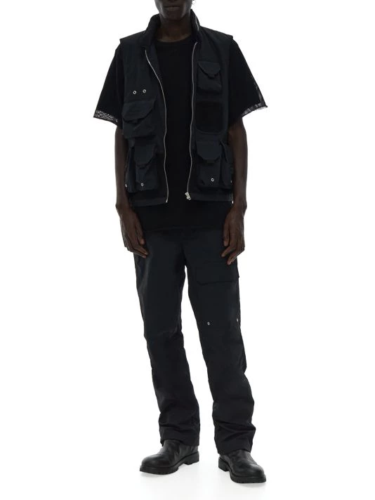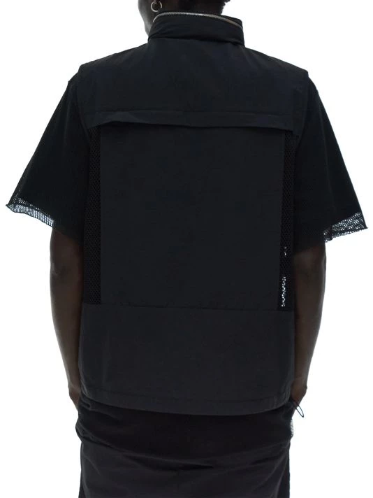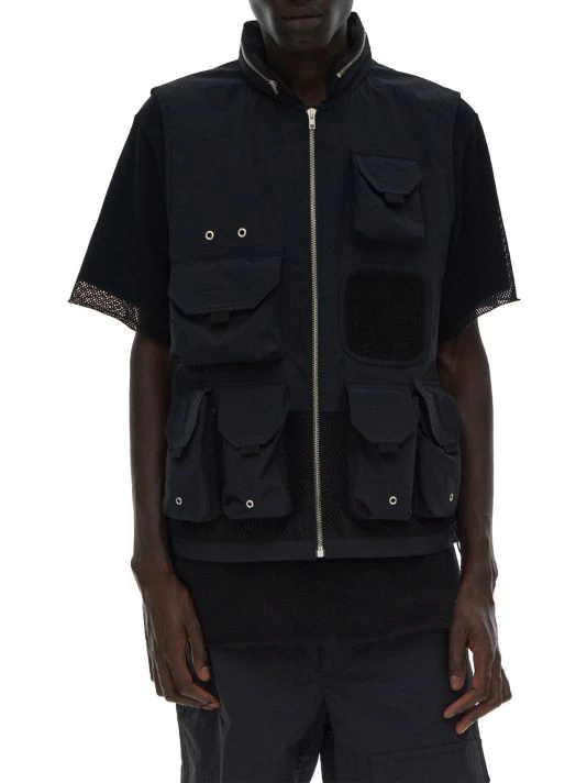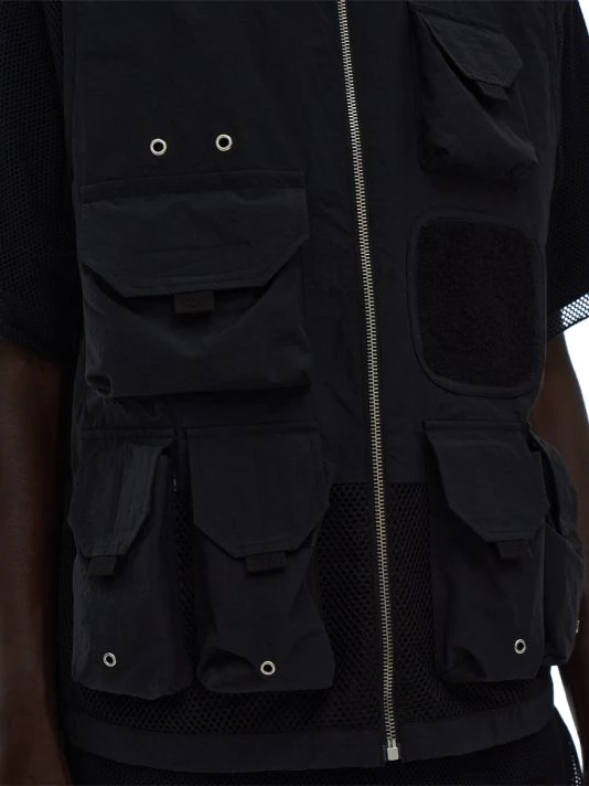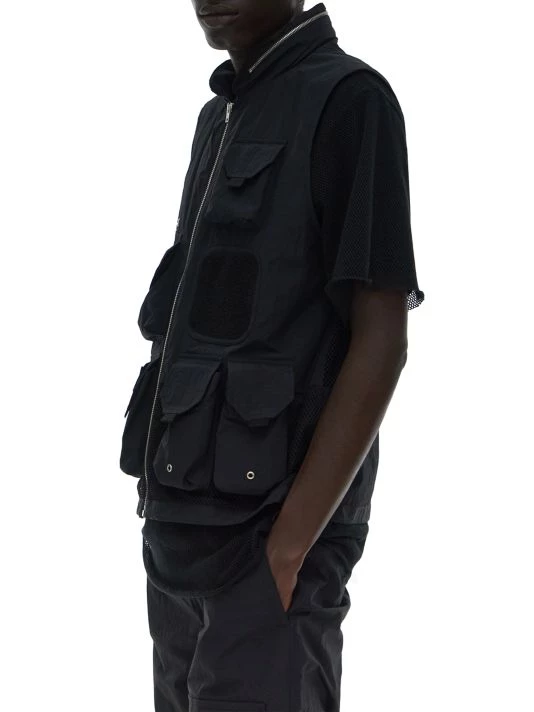 This nylon tactical vest features six flap pockets and a zip stand collar.