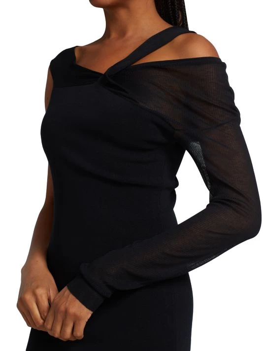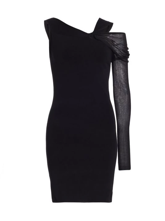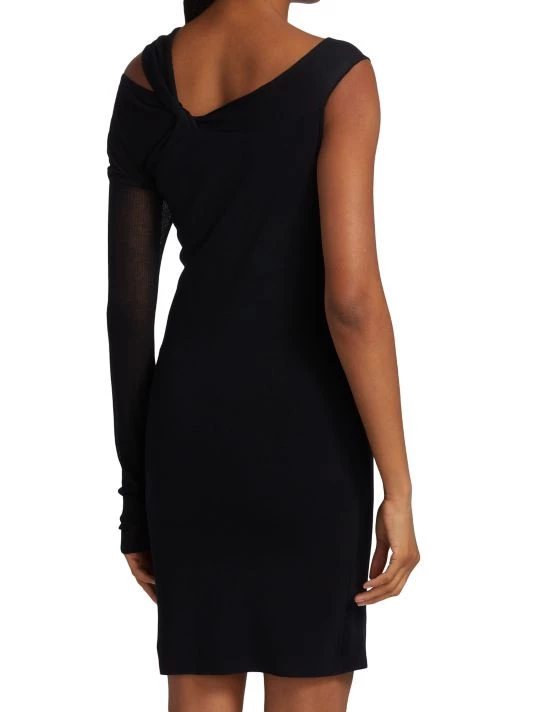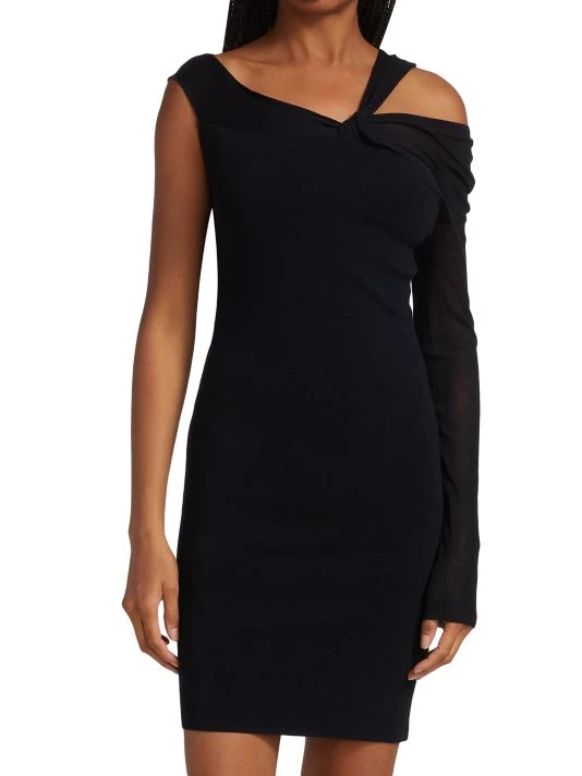 Cut in an off-the-shoulder silhouette, this minidress boasts a twisted neckline cut out and one long sheer sleeve.