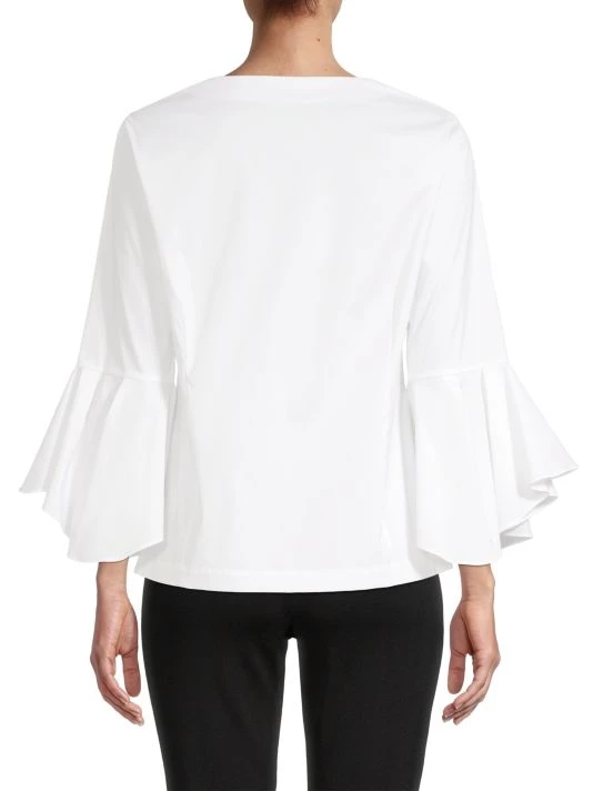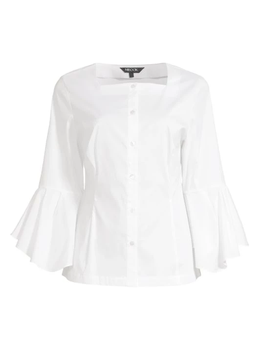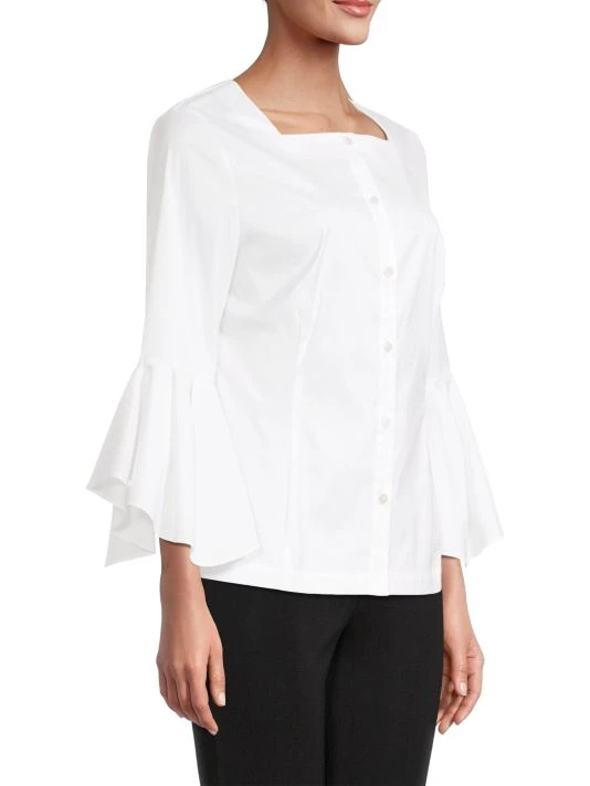 This cotton-blend Misook blouse features a square neck and a button-front closure. Bracelet-length sleeves with romantic, gathered bell cuffs finish the look.