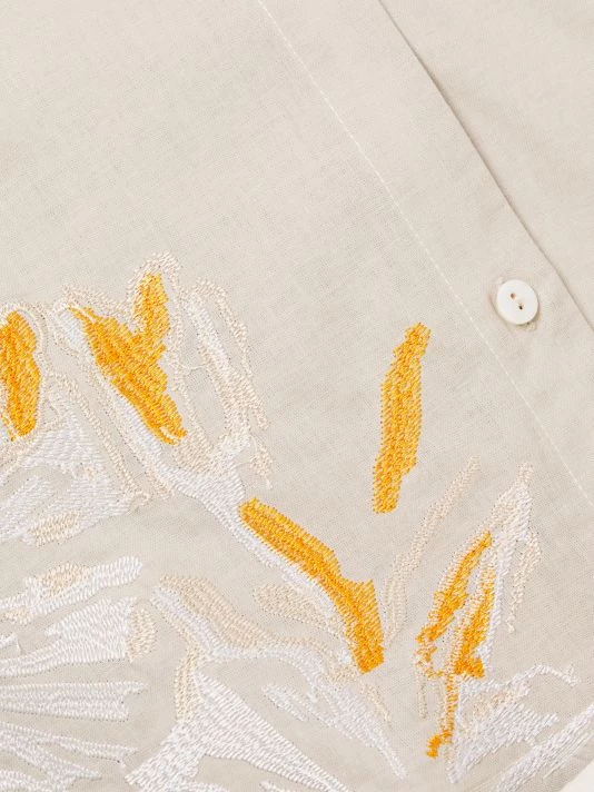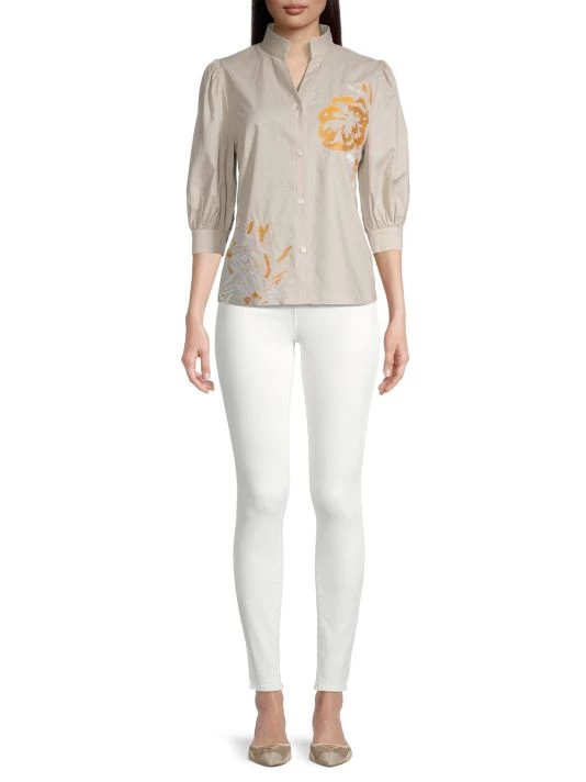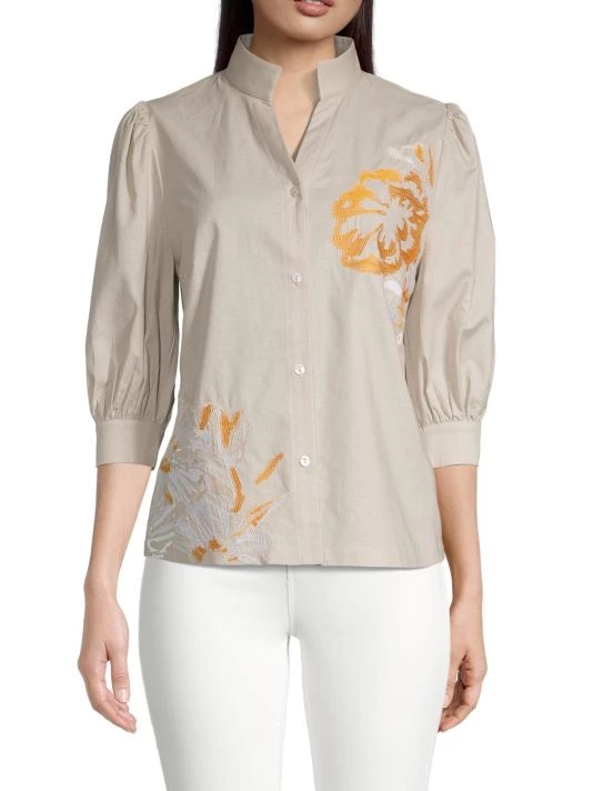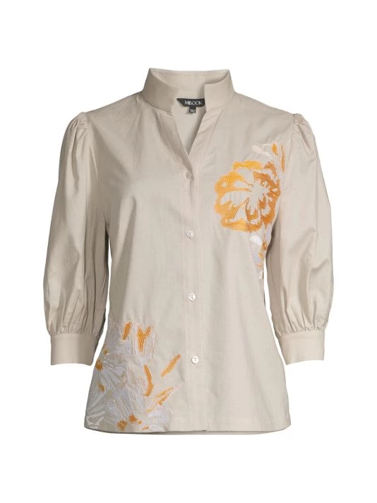 Crafted of a cotton-linen blend, this Misook blouse features a split stand collar and half puff sleeves. Tropical floral embroidery finishes this crisp style.