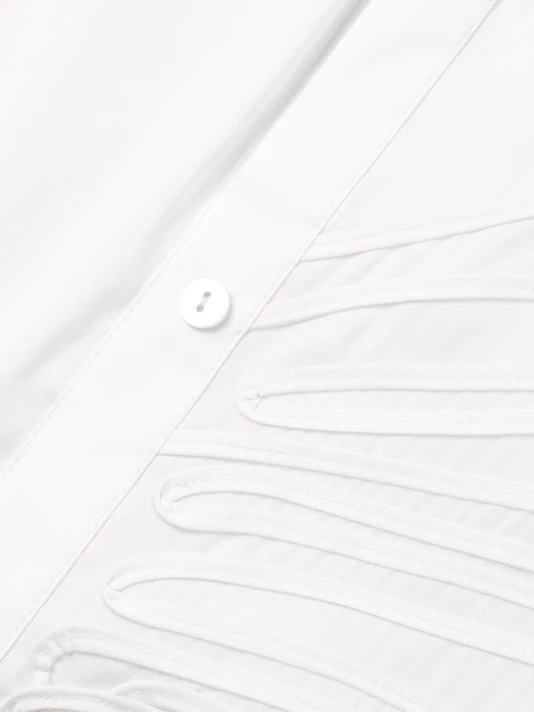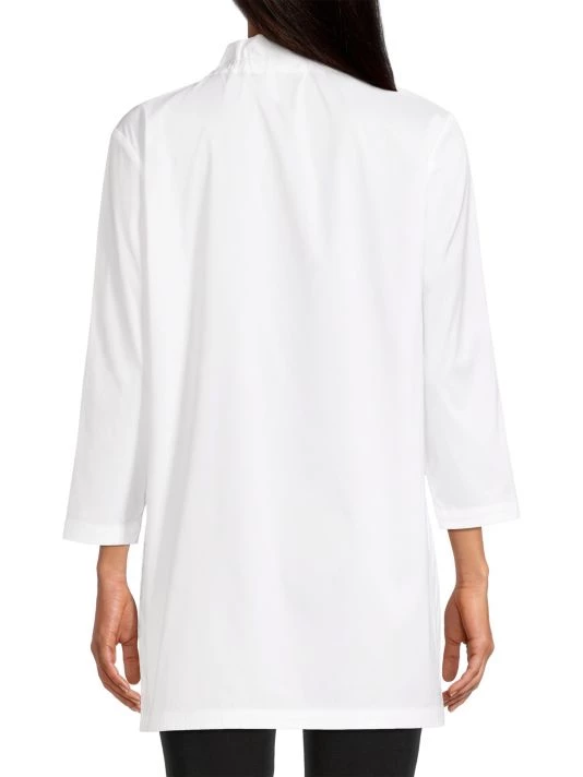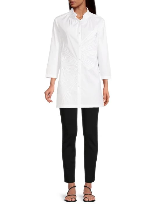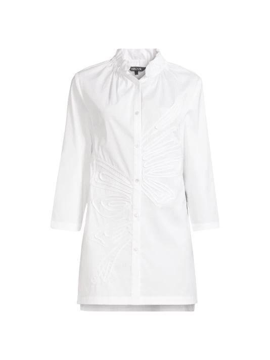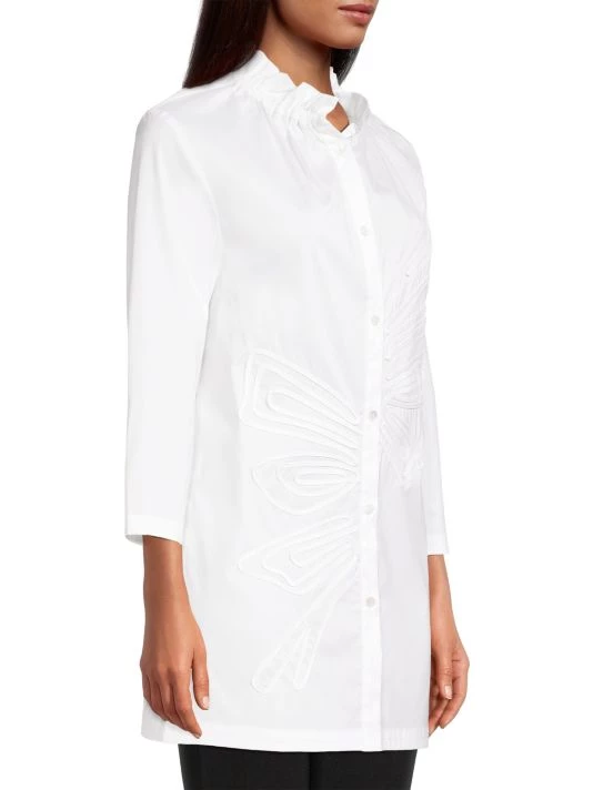 This long, cotton-blend blouse from Misook features a gathered stand collar and tonal soutache detailing in an artful, abstract design.