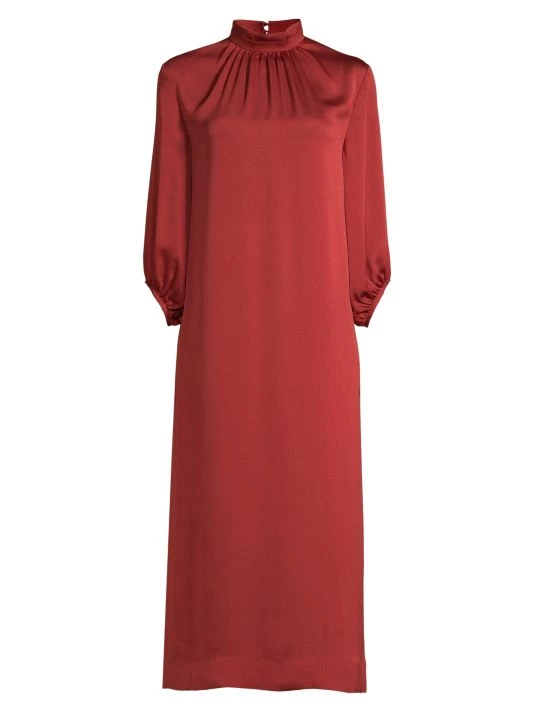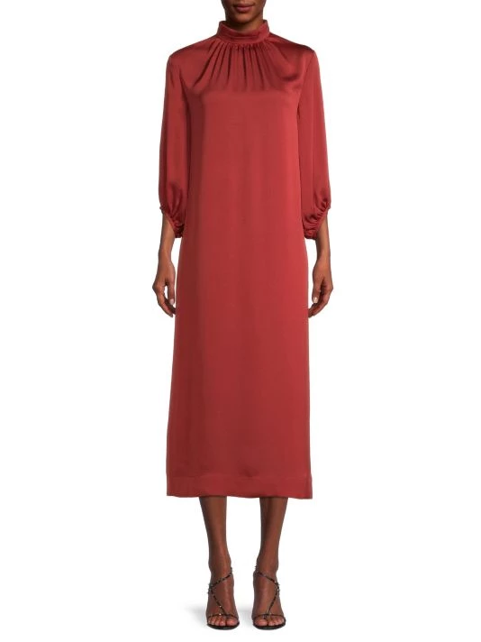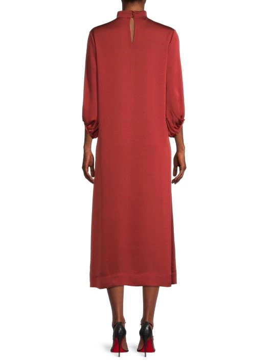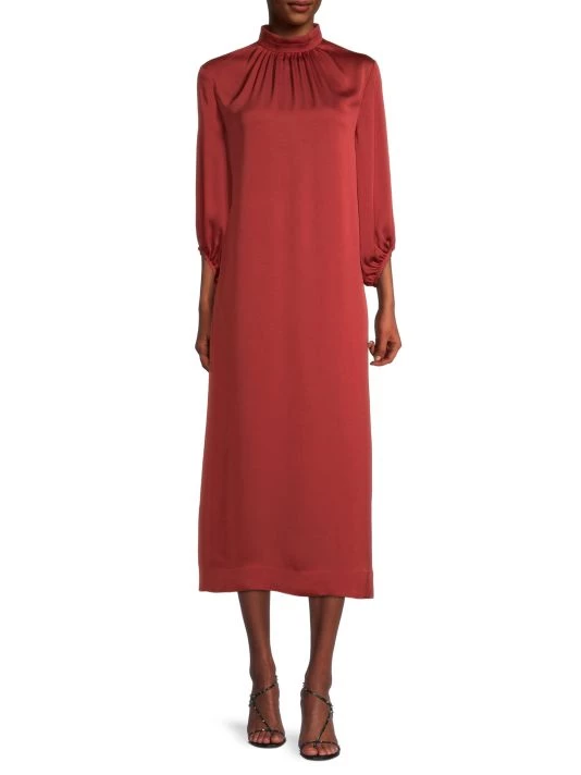 Softly flowing in light and luminous crepe de chine, Misook’s elegant midi-dress flaunts a stunning pleated mockneck. This romantic silhouette is finished with voluminous billowy sleeves.