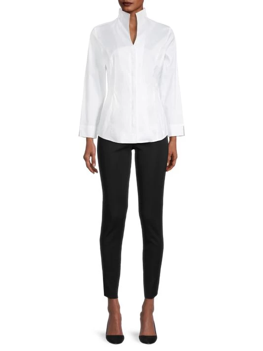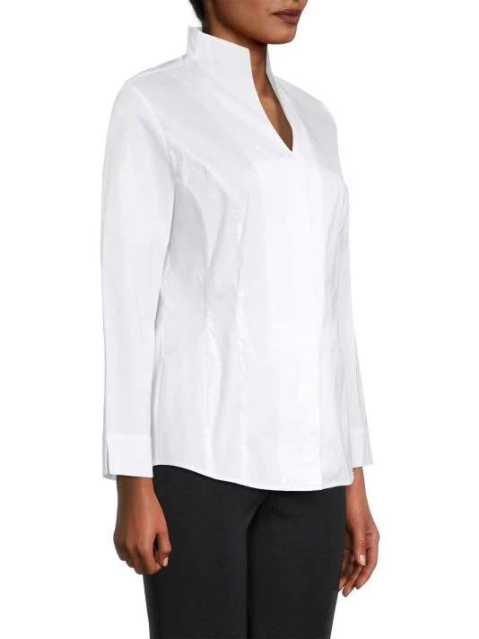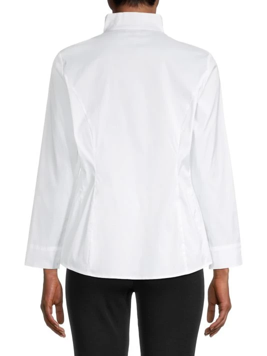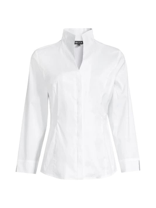 Misook’s tailored blouse is crafted of stretch cotton, featuring a stand collar, long sleeves, and darted seams.