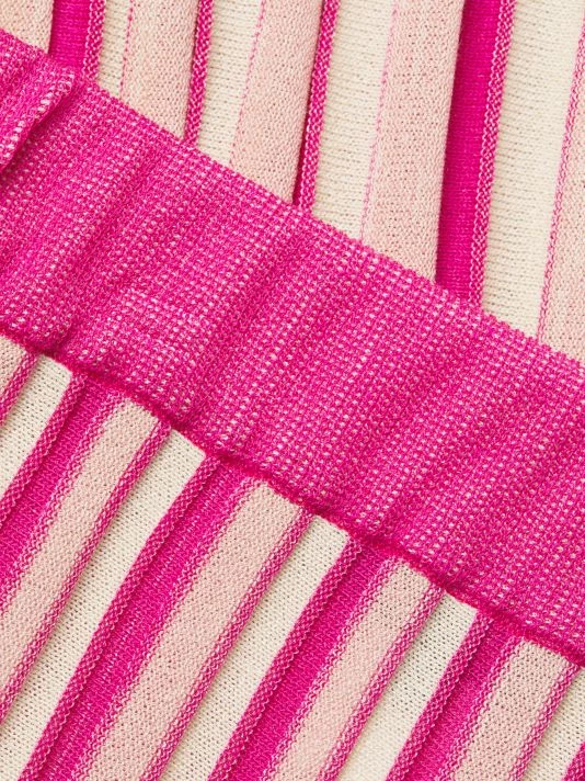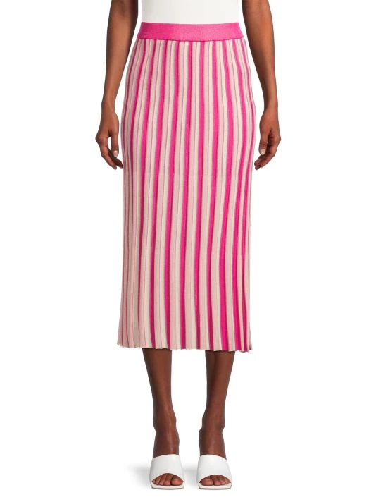 This high-waisted midi-skirt from Misook features a fitted silhouette in a striped rib-knit. A banded pull-on waist finishes this wrinkle-resistant style.