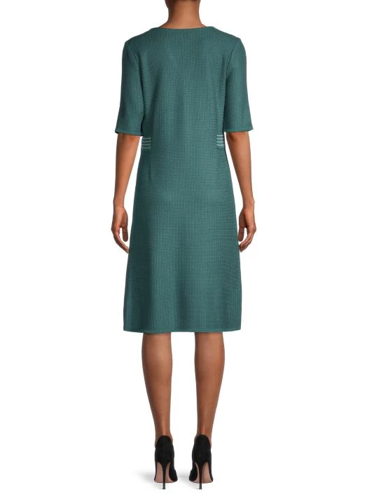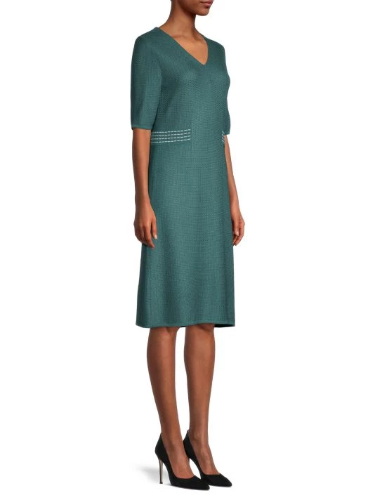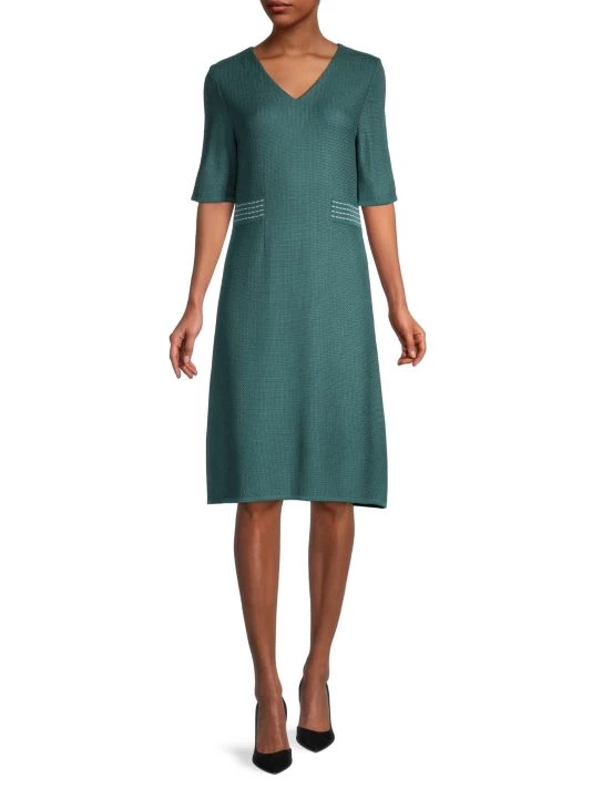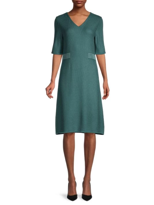 Wrinkle-resistant knit, A-line cut for comfort and flair, fade and stretch-resistant to hold its shape and color. Sometimes, simplicity is key to mastering sophisticated style. This dress brings luxurious texture, bold color, and a flattering silhouette into perfect balance, creating a look you can effortlessly slip on for casual-chic outfits and elegant ensembles alike. Featuring a classic V-neck that allows for easy accessorizing and patterned accents at the waist that visually bring in your figure, this dress is a standout style that makes it a breeze to look and feel your best any day of the week.